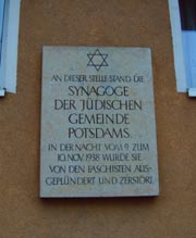 Die staatlich kontrollierten Massenmedien berichten, dass die alte Synagoge in Potsdam am Platz der Einheit in der Nacht vom 9. zum 10. November 1933 geschändet und am 14. April 1945 beim Luftangriff auf Potsdam weitgehend zerstört würde. 1954 erfolgte der Abbruch der Ruine, anschließend wurden an der frei gewordene Stelle neue Wohnhäuser gebaut.